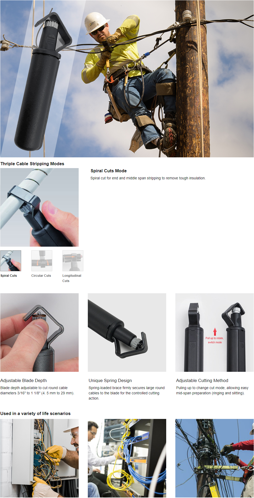 - ✔【Thriple Cable Stripping Modes】Triple action design because it can perform longitudinal cutting for end stripping, spiral cutting for end and mid-span stripping, and circular cutting to remove the jacket. This "spiral stripping mode" to strip and remove tough insulations.