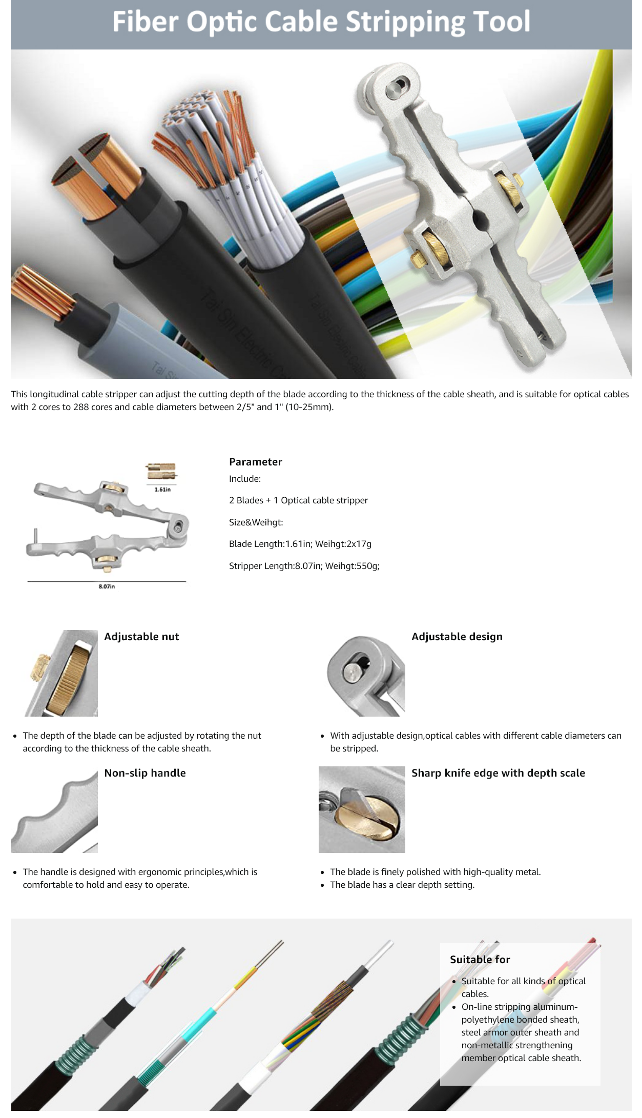 - ➽【Wide use】: This cable stripper can cut sheaths of various materials. Such as PVC, PE, steel armor sheath and non-metallic reinforced component fiber optic cable sheath, etc. Suitable for optical cables with 2 cores-288 cores and cable diameters between 2/5" and 1" (10-25mm).