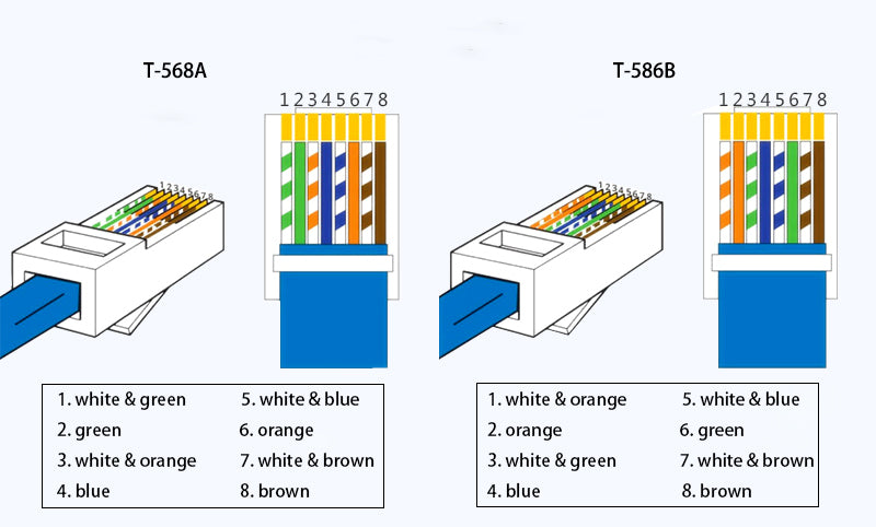 Hay dos estándares reconocidos por ANSI, TIA y EIA para la conexión del cable de red directo: T568A y T568B. Se pueden utilizar ambos estándares. Sin embargo, se considera que T568B es mejor que el estándar de cableado T568A. La siguiente figura es el diagrama de cableado de los dos estándares.