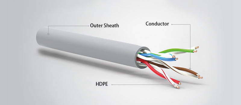 Como se muestra en la imagen de abajo, el cable LAN CAT5E consta de un conductor de cobre, HDPE y una cubierta exterior. Cada cable de red CAT5E tiene cuatro hilos de cobre en el interior y su extremo está conectado al conector RJ45 (cabezal de cristal) conectado. Hay dos tipos de cables CAT5e: de conexión directa y cruzada. La diferencia entre la coincidencia directa y cruzada se explicará en detalle a continuación.