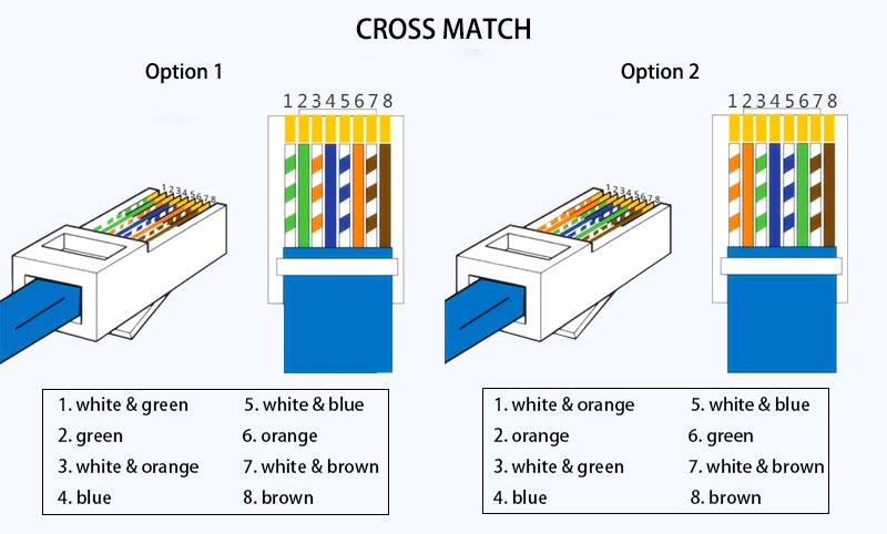 Cuando realiza un cableado directo, las salidas de cable en ambos extremos del cable CAT5e deben ser las mismas. Sin embargo, para la coincidencia cruzada, los cables conductores RJ45 en ambos extremos del cable CAT5e son diferentes. La siguiente figura es un diagrama esquemático de la terminación cruzada de 8 cables.